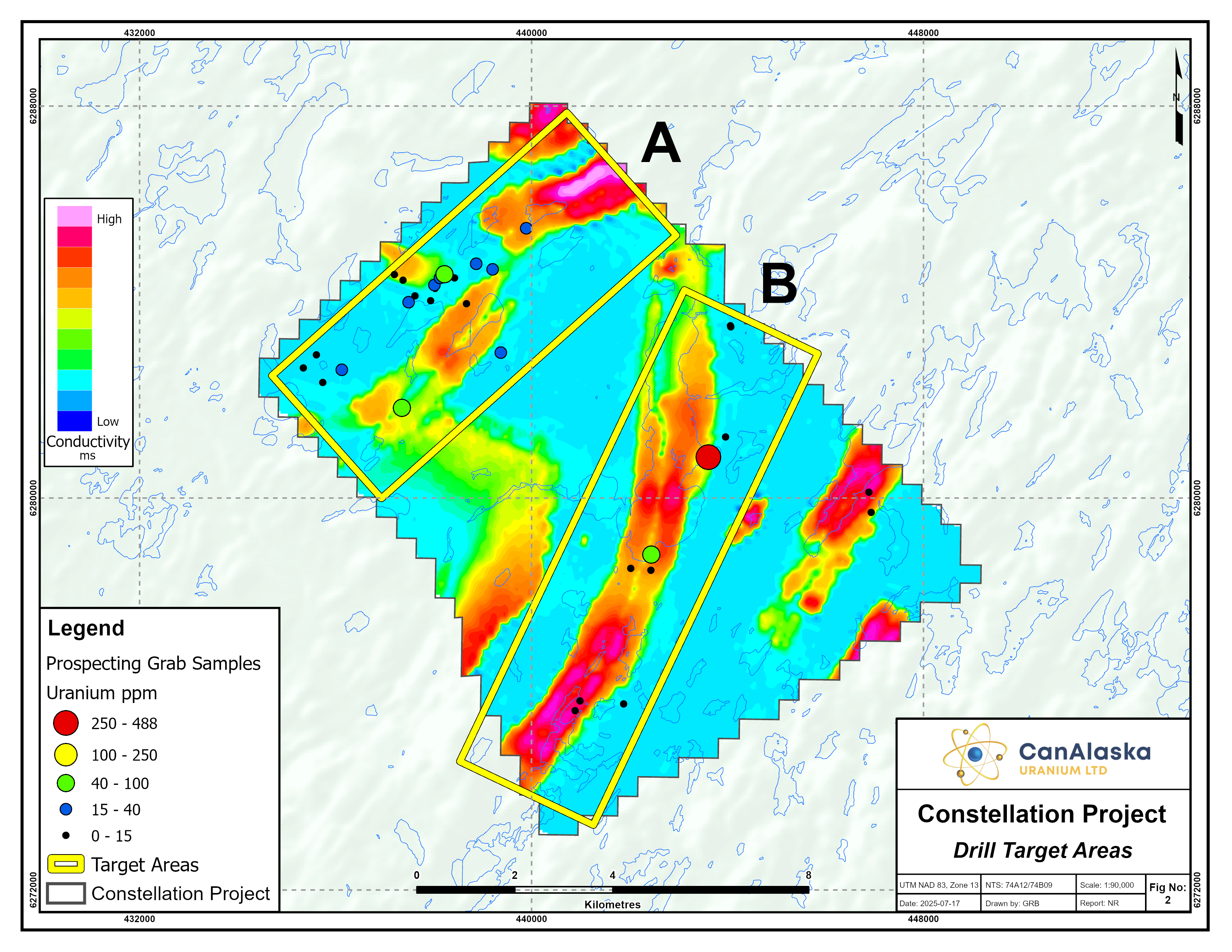 The Company recently completed a project wide VTEM survey. The goal of the survey was to identify and prioritize basement conductors, characterize lithological and alteration variations, and map the structural setting of the project to support future drill targets. The Company completed a ground-prospecting program in 2024 that identified anomalous uranium and alteration in two key target areas. The Company subsequently completed a small drill program to test a few of these results.