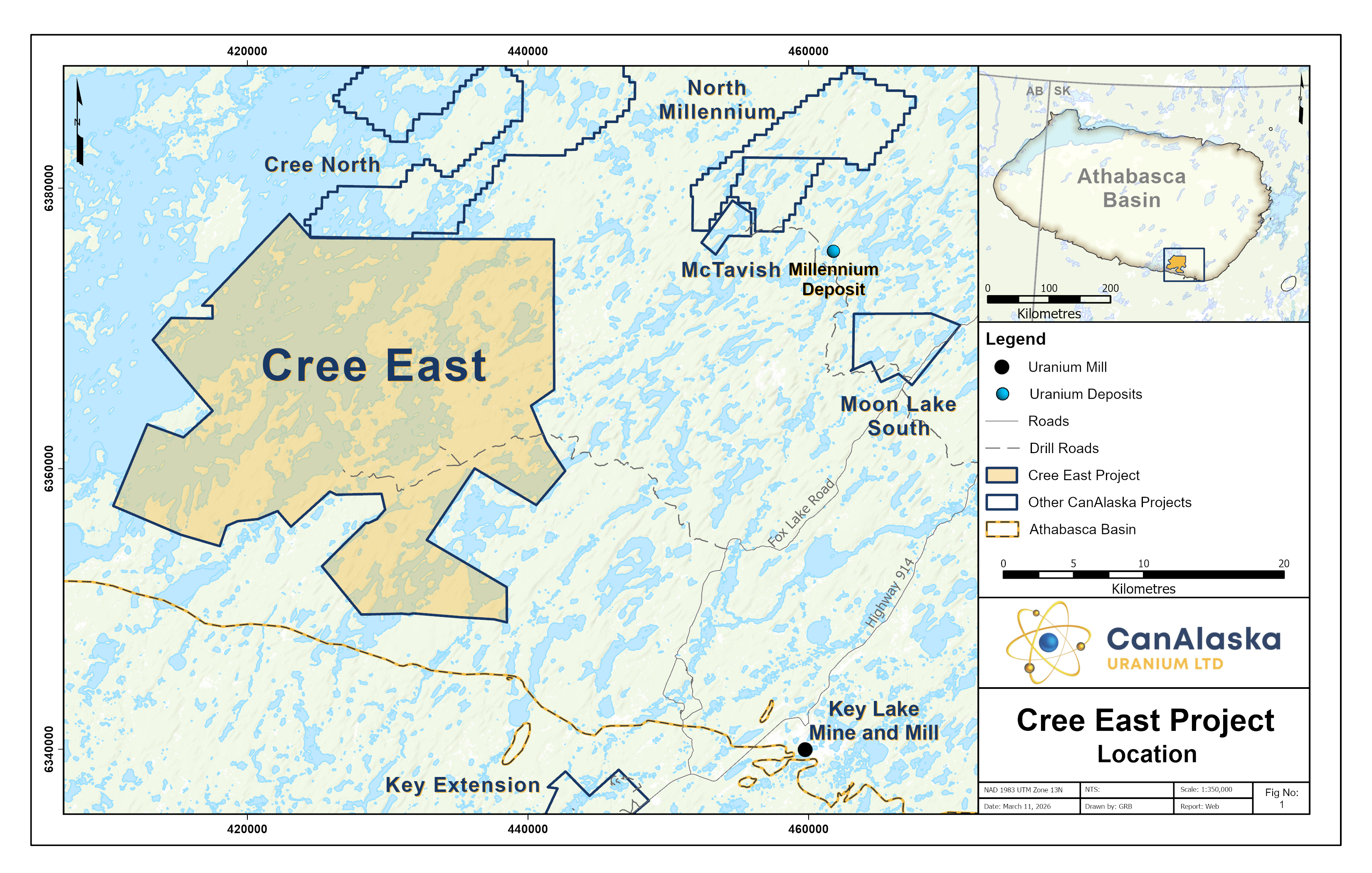 The Cree East project is a high-priority property located in the south-eastern portion of the Athabasca Basin, 35 km west of the formerly producing Key Lake mine and 5 to 22 km north of the south rim of the Athabasca Basin. The project is comprised of 16 contiguous mineral claims totalling 55,935 ha and is 100%-owned by CanAlaska.