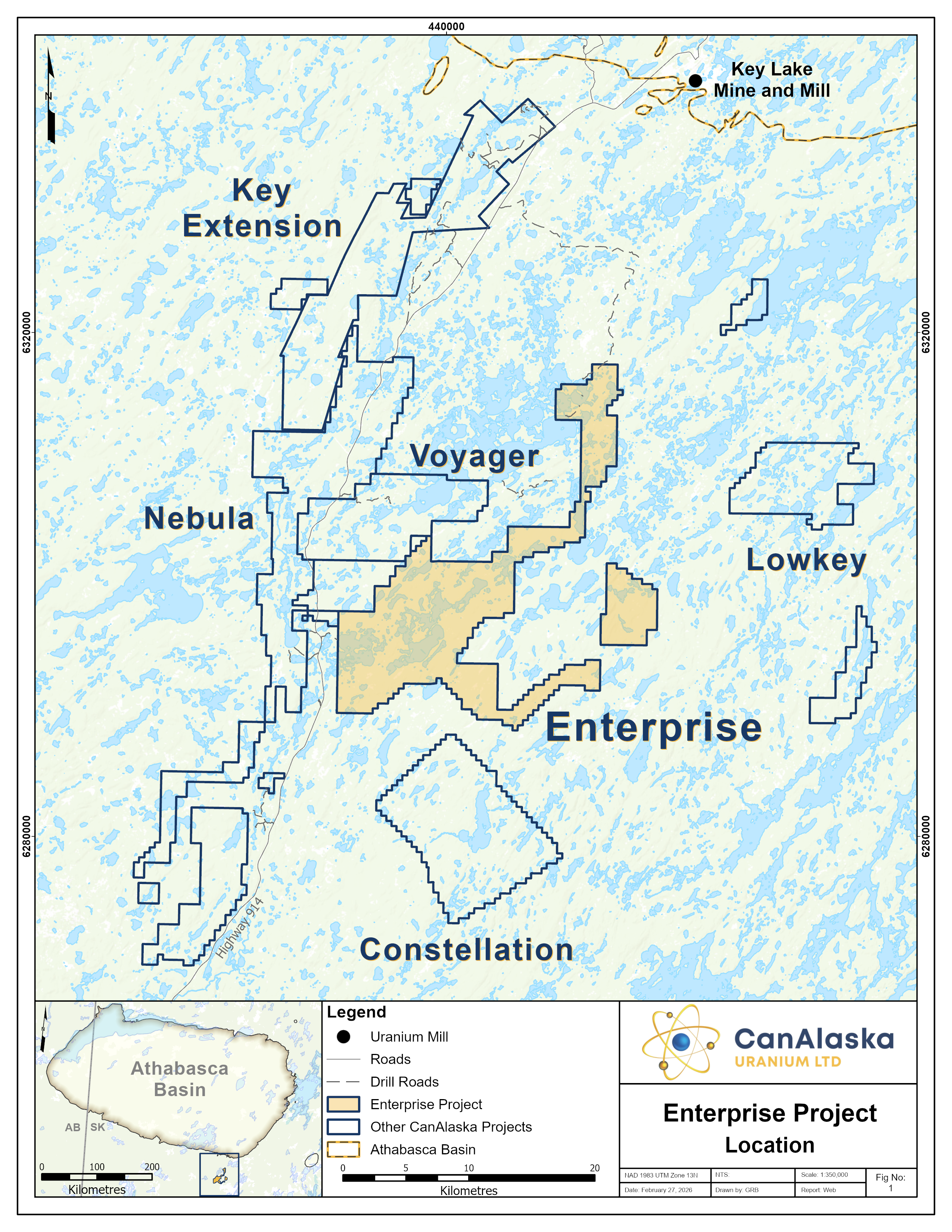 CanAlaska’s Enterprise property, totaling 20,793 ha, is located in the southeastern Athabasca Basin. The project is twenty kilometres south of the present-day Athabasca Basin edge and the Key Lake Mine and Mill complex along Highway 914. Historical exploration on the project consists of prospecting and geological mapping that were completed in conjunction with airborne radiometric, electromagnetic, and magnetic surveys in the 1970’s and 1980’s. In the early 2000’s, a helicopter-borne AeroTEM electromagnetic and magnetic survey was completed and followed up by a series of ground-based gravity and Horizontal Loop EM (HLEM) surveys. The gravity and HLEM surveys identified two conductive corridors on the northern claims, Target Corridor 1 and Target Corridor 2, that have associated gravity low anomalies. These target corridors represent drill-ready target areas on the project. The Company recently completed a modern high-resolution VTEM, Radiometrics, and Magnetics survey across the project which identified numerous high-priority target areas. The company is actively seeking joint-venture partners for its Enterprise project.