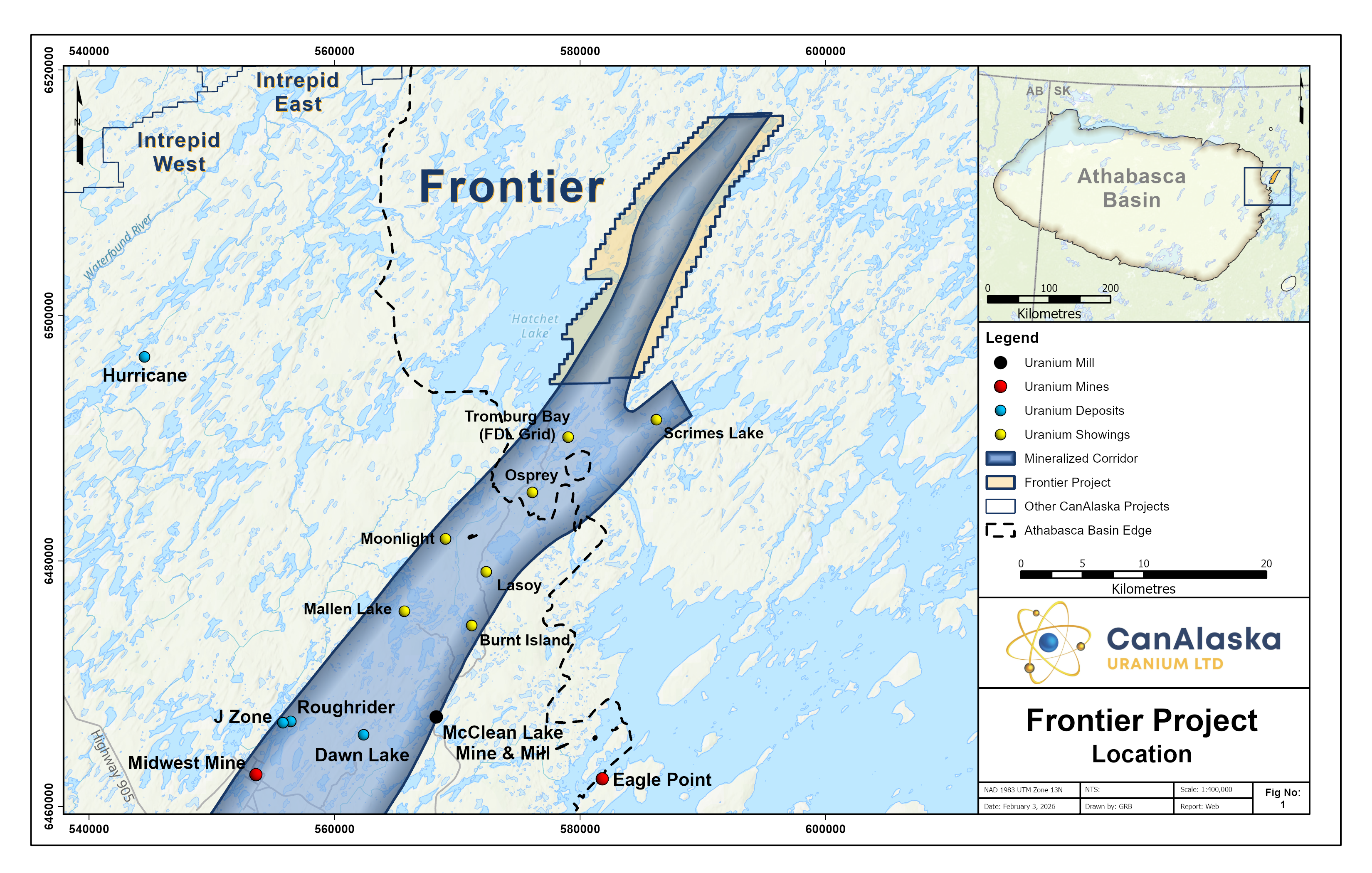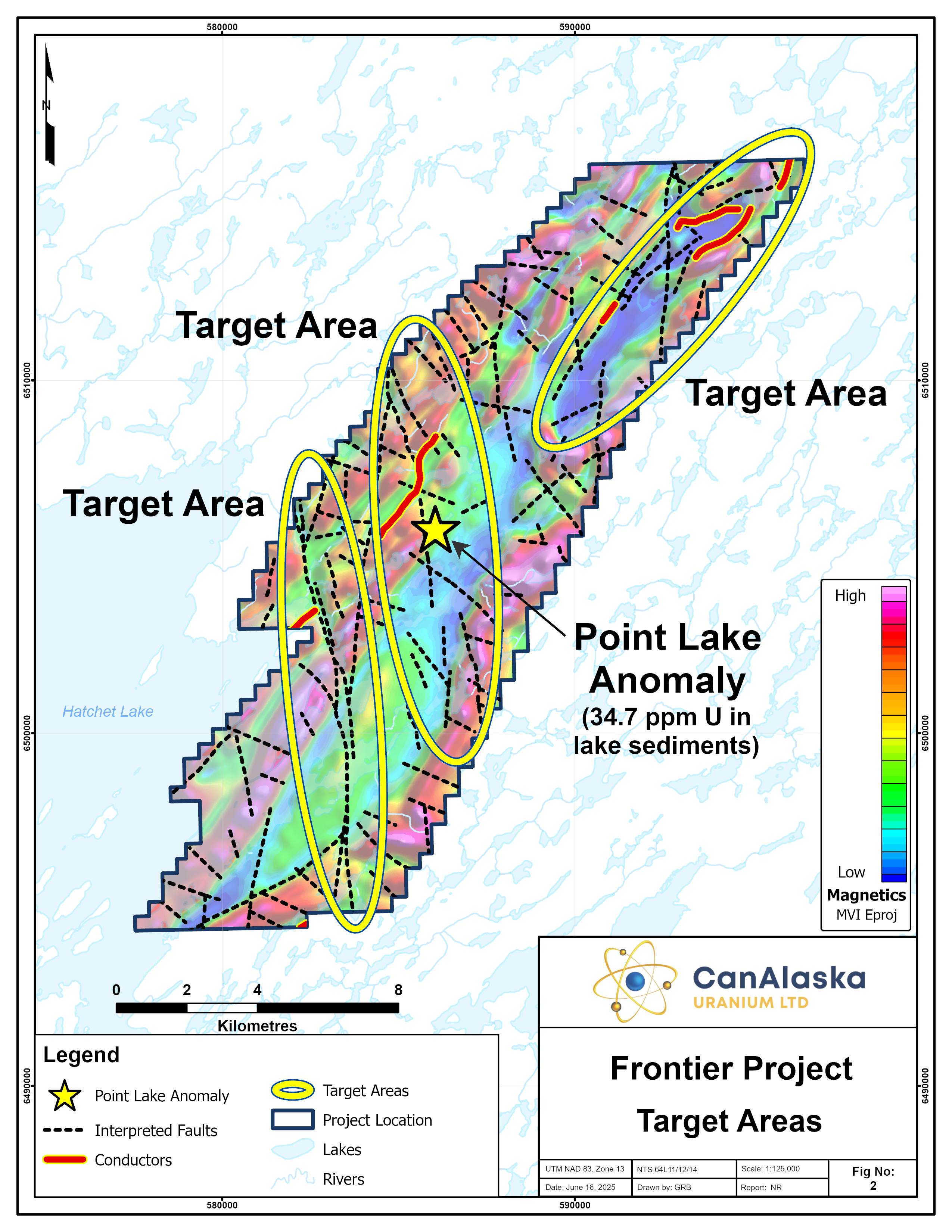 CanAlaska’s Frontier property, totaling 15,929 ha, is located in the northeastern Athabasca Basin. The project is five kilometres northeast of the present-day Athabasca Basin edge along the regional-scale Roughrider Mineralized Corridor (RMC). The RMC is host to multiple uranium deposits and showings, including Roughrider, Midwest, J Zone, Dawn Lake, Moonlight, Osprey, and the McClean Lake mine (Jeb deposit) and mill complex. On the property, the RMC is bound by magnetic high bodies to the east and west with major corridor parallel and cross-cutting magnetic structural lineaments. The interplay between structures along long linear magnetic low corridors is typical of many unconformity uranium deposits in the Athabasca Basin and allows for the creation of structural traps for potential uranium deposition. Historical exploration on the project has been limited to regional airborne and prospecting which identified the Point Lake anomaly. More recent work on the project includes a detailed property-wide aeromagnetic survey and a small VTEM survey on the very southern portion. The company is actively seeking joint-venture partners for its Frontier project.