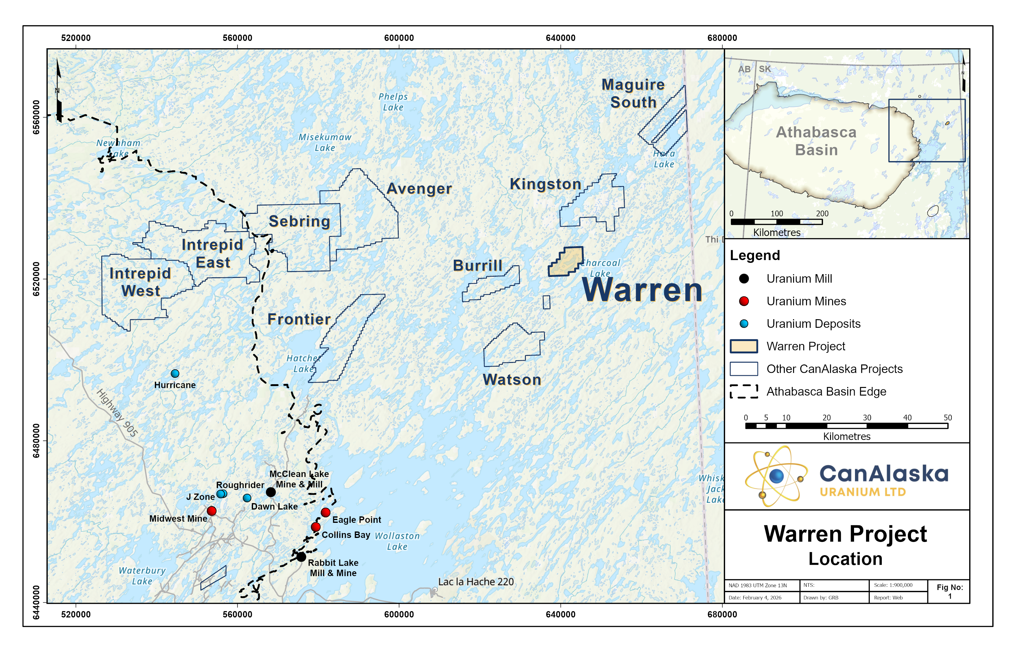 CanAlaska’s Warren property, totaling 4,901 ha, is located 75 km from the northeastern margin of the present-day Athabasca Basin, Saskatchewan, Canada. The Warren project is part of CanAlaska’s NE Wollaston land package, where the main target is basement-hosted uranium deposits similar to Eagle Point or Arrow. The project is located Northeast of the Watson Project straddling the interpreted Collins Bay Fault where the associated linear conductors are cross-cut by at least two east-northeast trending faults newly identified from historical magnetic surveys. These cross-cutting features also trend into the Burrill Project area to the west and the potential of this structural setting had not been recognized. As a result, no significant exploration has ever been completed in the Warren area. The company is actively seeking joint-venture partners for its Warren project.